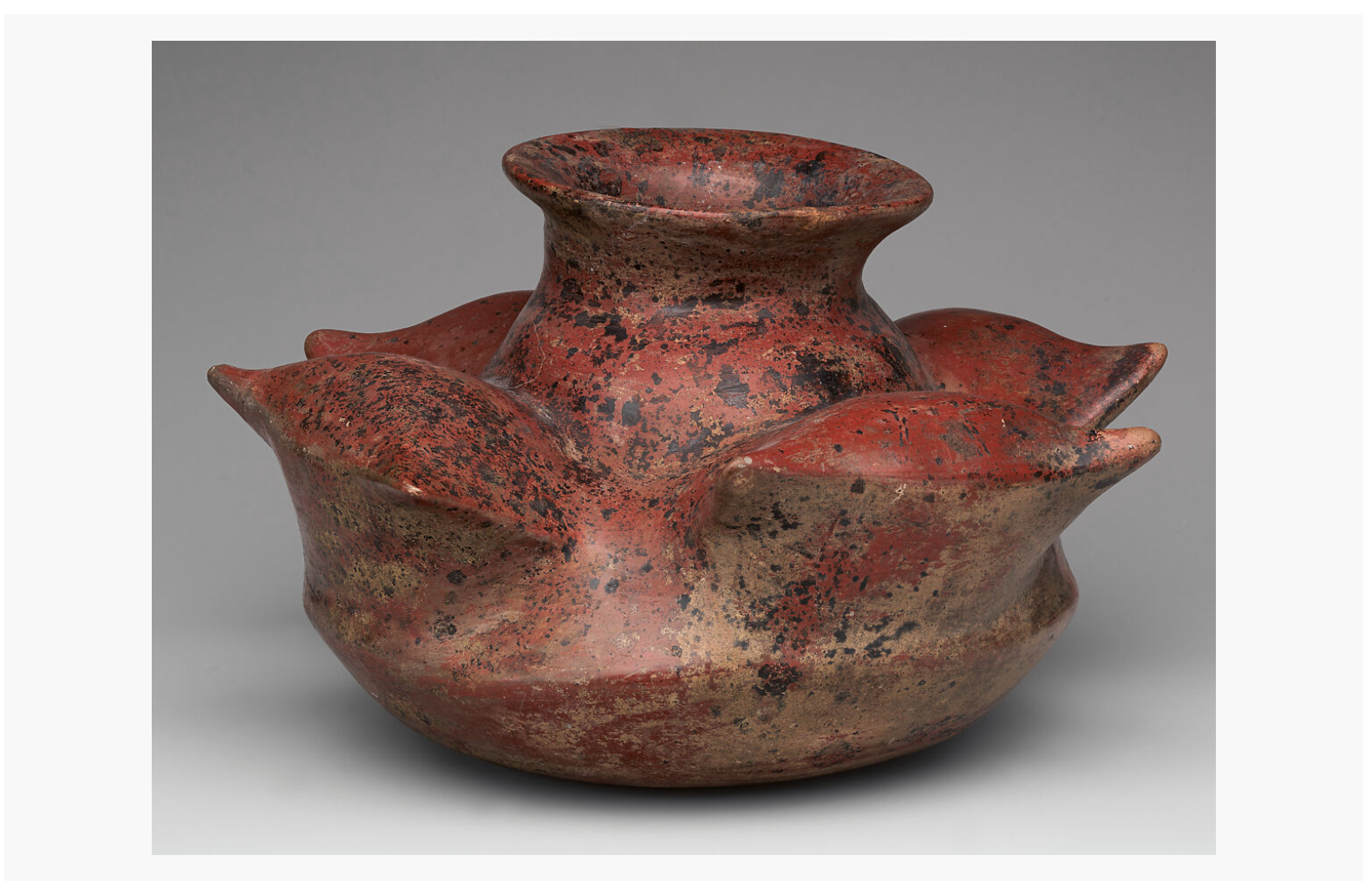 “Like other ceramic objects from Colima, the subject matter of this vessel was taken directly from the imagery of daily life. The four projecting elements of this pot are representations of a regional food staple, the succulent base of the maguey agave cactus leaf that even today is roasted and sold in the local markets of western Mexico, the area from which this jar came.