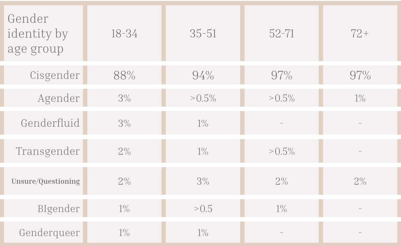 However, ever since 2017, a greater portion of the Gen Y and Z sample size doesn't even feel as though they identify strictly on one end of the spectrum or the other when compared to other generations. This target audience wants to see themselves represented authentically in all sectors of the industry.