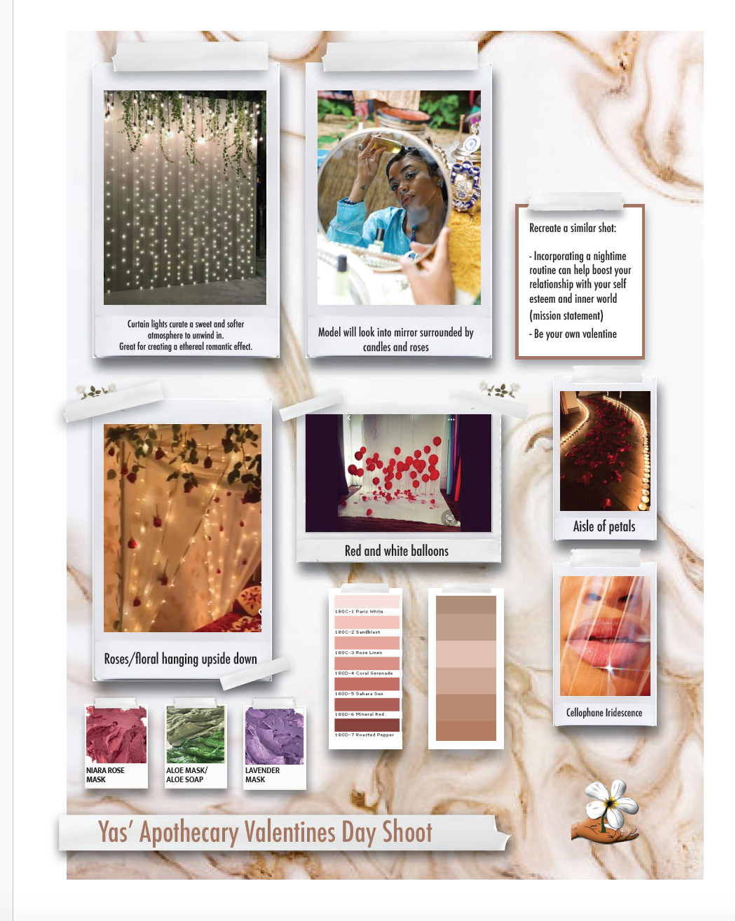 Task: Design a mood board honoring self-love with soft romantic elements. The moodboard must complement the natural tones of the Niara Rose and lavender masks, specifically for the spring Ghassoul Clay Mask campaign.